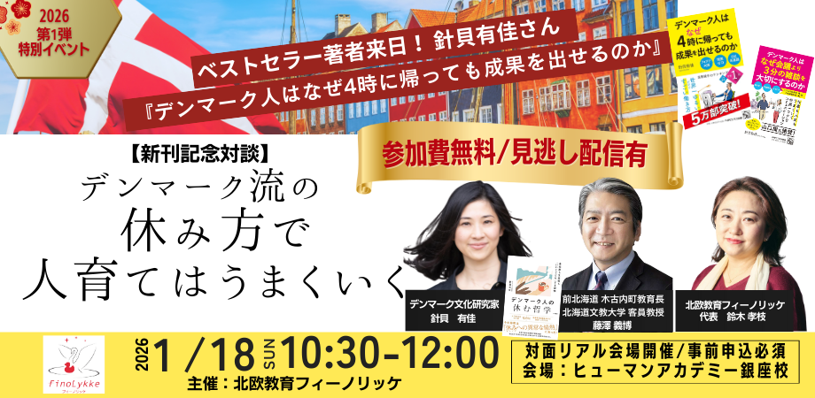 | 登壇者 | ・針貝 有佳(はりかい ゆか) デンマーク文化研究家 ・藤澤 義博(ふじさわ よしひろ) 前 北海道木古内町 教育長 北海道文教大学 客員教授 ・鈴木 孝枝(すずき たかえ) 株式会社フィーノリッケ代表 |